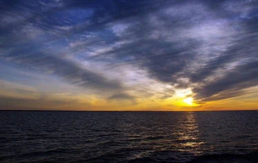 Golden light over calm river delta waters