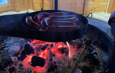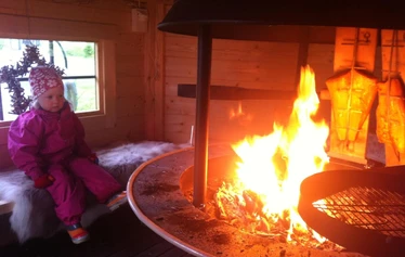 Hot drink (glögi) and sweet pastry by an open fire inside a warm wooden hut (kota)
