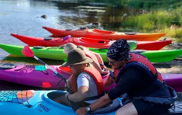 Vanhempi ja lapsi melomaan yhdessä samalla kajakilla