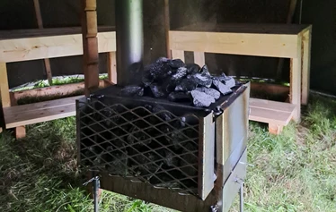 Telttasaunassa on lauteet kahdeksalle hengelle, ja sen kiuas lämpeää puilla. Löylyt ovat täysin erilaiset kuin perinteisessä saunassa – ne ovat lempeät, mutta ilma pysyy samalla raikkaan hapekkaana. Kamiinan päällä voidaan lämmittää vettä erillisessä astiassa, jolloin pesuvesi on helposti saatavilla.